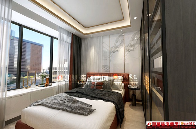 圖5.亮點:為避免單調(diào),主臥床頭背景采用護墻板結合鈦金條的設計,頂面吊頂相互呼應。