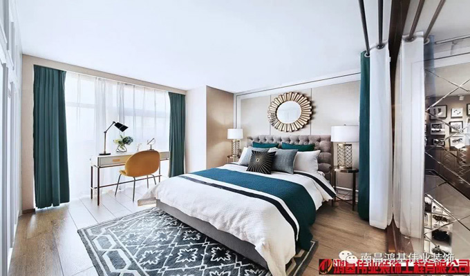 臥室靠外窗窗簾的設(shè)計(jì)采用窗簾+紗,使空間滿足采光的同時(shí)又增加居室的隱私性。