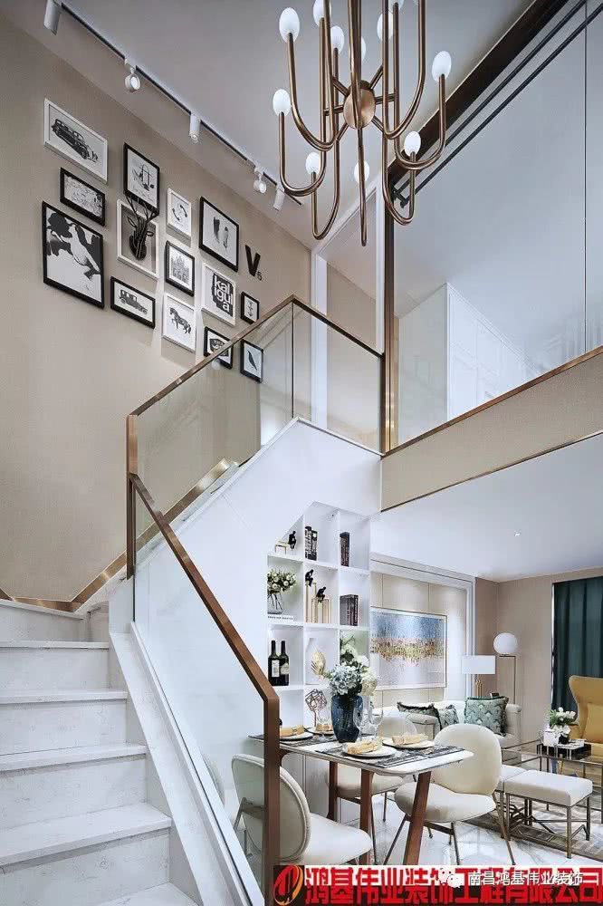 樓梯踏步采用大理石鋪設(shè),增加踏面寬度;樓梯扶手采用透明鋼化玻璃+玫瑰金包邊,時(shí)尚且實(shí)用。