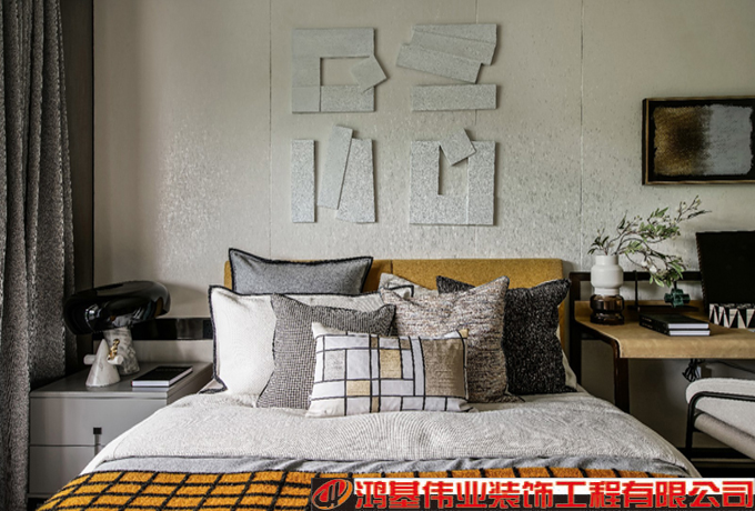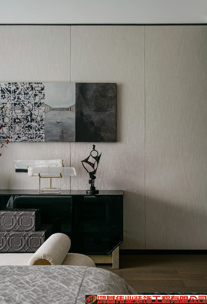 長輩房延續(xù)客餐廳的整體調(diào)性,多采用啞光飾面和手工質(zhì)感的肌理,細(xì)膩的淺灰色皮質(zhì),胭脂紅圓形藝術(shù)品,呼應(yīng)材質(zhì)本身的層次與質(zhì)感去傳達(dá)空間的氣韻。