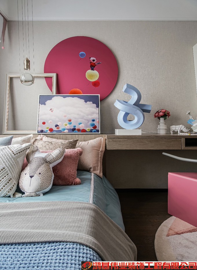 女孩房以低飽和度顏色的對比來延續(xù)溫馨與鮮活,書桌的設(shè)置,豐富了空間的可能性。