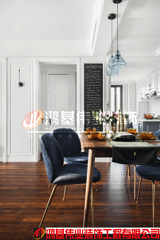 餐廚的過道之間做了一塊黑板墻,濃重的黑色很好的將顏色調(diào)度,可以貼一些便利貼、寫上一些詩文;藍(lán)色的椅子配上墨綠色的桌旗,整齊擺放的餐盤今日份的鮮花,都是主人家滿滿的儀式感。