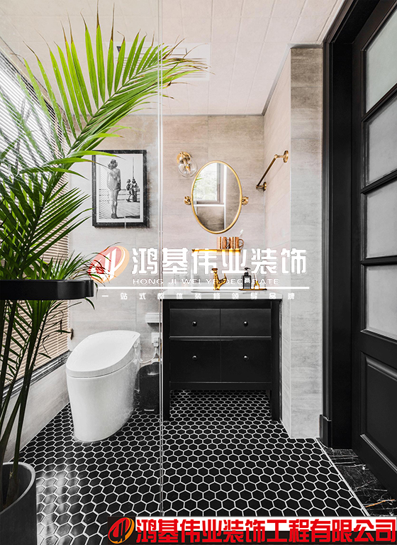 主臥藍(lán)綠色背景墻,金屬小飾品、深藍(lán)色的床單、臟粉色小抱枕、幾何圖案的小蓋毯,色彩濃重鮮明、復(fù)古又現(xiàn)代;主衛(wèi)的地面用了黑色馬賽克磚,房門與洗臉臺(tái)也告別了外衛(wèi)的小清新,延續(xù)了更衣室柜門的黑色,配色金屬色的圓鏡與壁燈,營造出復(fù)古又輕奢的高級(jí)質(zhì)感。