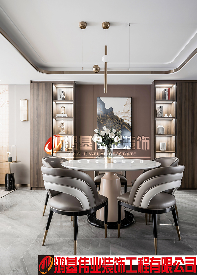 背景以對稱的開放柜 和大塊面的木飾面結合的方式來增加餐廳區(qū)域的儀式感圓桌讓環(huán)繞動線更為流暢舒適。