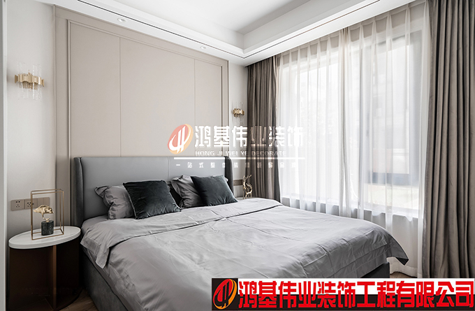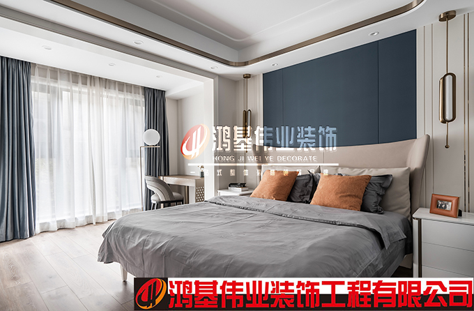 主臥空間在延續(xù)整體簡潔、明亮的設計基礎上增加了一些色彩搭配深湖藍色的背景墻配以灰色的窗簾浪漫而不失莊重。