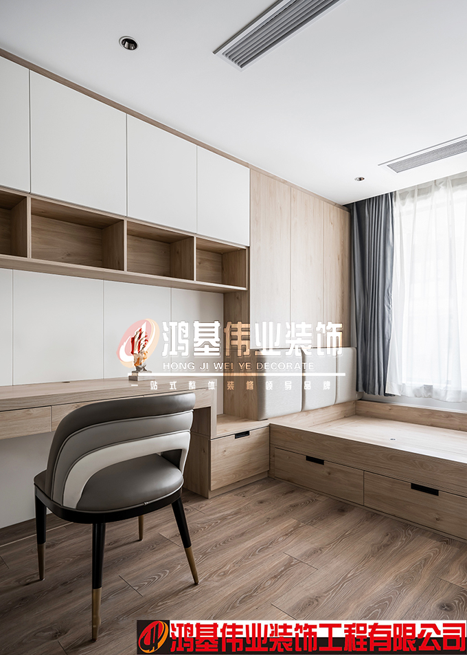 榻榻米結合書柜、書桌的定制形式讓書房有限的空間最大化被利用并兼具了客房功能原木風格清新、自然、質樸提升了空間的暖度。