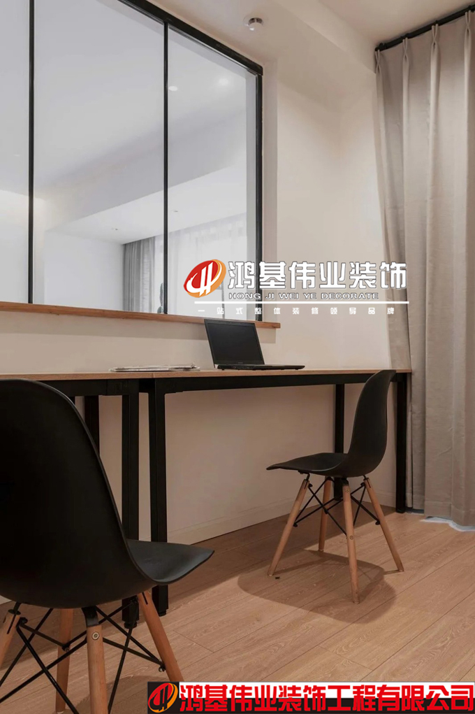 書房作為連接兩個(gè)部分的樞紐,顏值相當(dāng)重要,這里的玻璃隔斷也會(huì)作為客廳背景。但因?yàn)闀颗c客廳相通,所以在色調(diào)上書房用了安靜的淺灰色,希望用視覺的不同將兩個(gè)空間進(jìn)行區(qū)分。