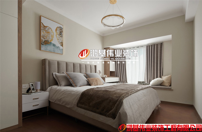 主臥沙色背景搭配灰褐色絨布質(zhì)地的床,極為近似的低明度賦予了空間安靜溫暖的調(diào)性,太妃糖色與淡孔雀藍色交織的掛畫,為空間增添了一絲靈動。