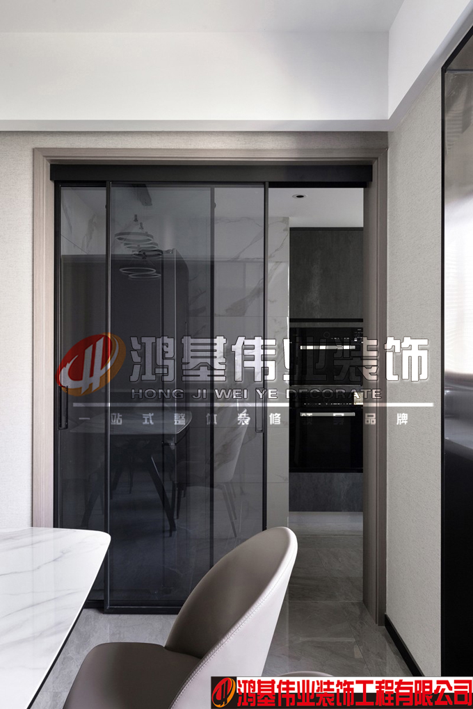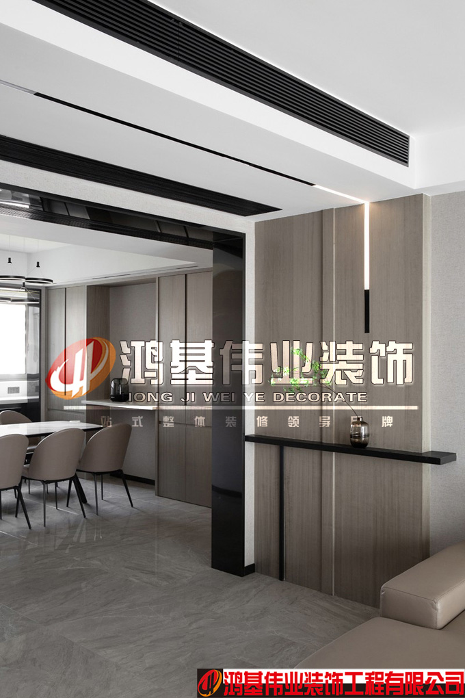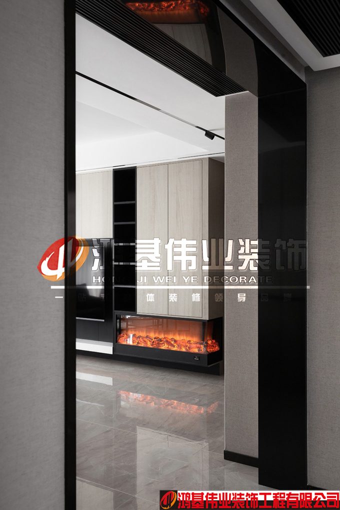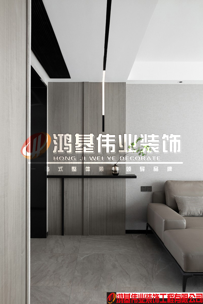 我們將頂面與墻面的關系通過燈帶線架構(gòu)在一起,空間中不同的材質(zhì)可完成一個很好的過渡作用,隨之用玄關背景的黑色“7”字與之形成呼應。