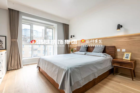 臥室床頭墻以木色背景,搭配顏色稍深的木質(zhì)床與床頭柜,整體顯得層次豐富有檔次。兩側(cè)床頭柜上方還有吊燈,為床頭帶來了溫馨舒適的照明,結(jié)合木質(zhì)背景墻,靠在這里看書閱讀,將會(huì)是一個(gè)暖心舒適的愜意生活。大面積的落地窗稍微外拓,暖灰色床單搭配,整體簡單素雅的軟裝布置,充滿了簡約大方的氣質(zhì)感。