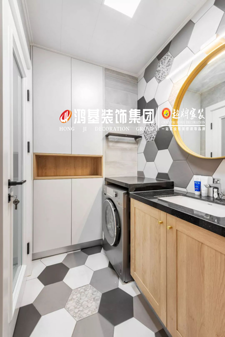 衛(wèi)生間以不同顏色紋理的六邊磚拼接地面墻面,搭配木質(zhì)洗手盆柜與側(cè)邊白色的收納柜,洗衣機(jī)嵌入到洗手盆旁邊的臺(tái)面下,小小的空間也充滿文藝自然的氛圍感。