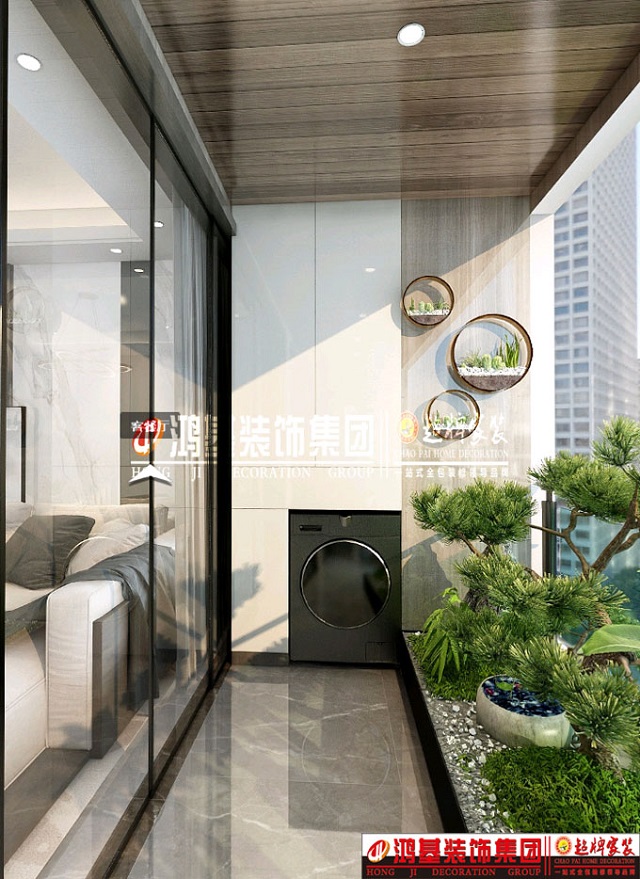 圖4.亮點:陽臺西側(cè)滾筒洗衣機和儲物柜的結(jié)合設計,充分利用空間。衛(wèi)生打掃更加方便,不留死角。 東側(cè)留有更多的空間可以培養(yǎng)綠植及休閑,給陽臺空間增添生機。