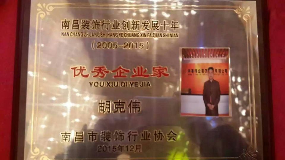 南昌市東湖區(qū)人大代表、區(qū)工商聯(lián)副主席、鴻基偉業(yè)裝飾公司總經(jīng)理胡克偉先生榮獲《優(yōu)秀企業(yè)家》榮譽(yù)稱號(hào)