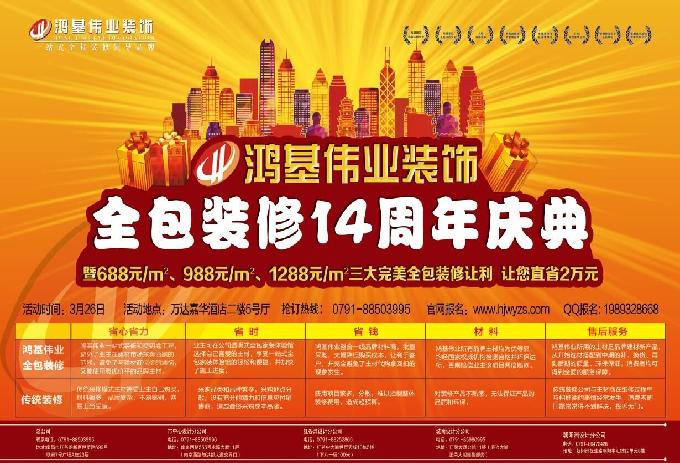 鴻基偉業(yè)裝飾14周年感恩慶典鉅惠活動(dòng)將于3月26日(星期日)在紅谷灘新區(qū)萬(wàn)達(dá)嘉華酒店盛大舉行。讓你最高直省2萬(wàn)元,活動(dòng)前訂單越早優(yōu)惠越多。搶訂熱線:0791---88503995(紅谷灘聯(lián)泰7號(hào)廣場(chǎng)總部), 網(wǎng)絡(luò)報(bào)名:www.cqjiangjun.com