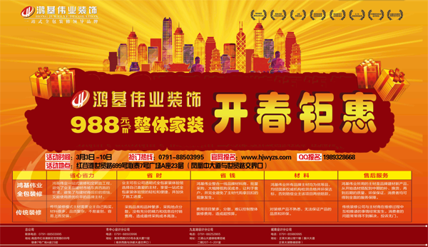 春暖花開,裝修旺季也逐漸拉開了大幕。作為南昌裝飾行業(yè)領(lǐng)軍品牌企業(yè)、南昌本土全包裝修領(lǐng)導品牌、南昌家裝十強企業(yè),鴻基偉業(yè)裝飾公司將在3月3日至10日推出“988元每平方米整體家裝,開春鉅惠”活動,將引爆全城裝修熱潮。