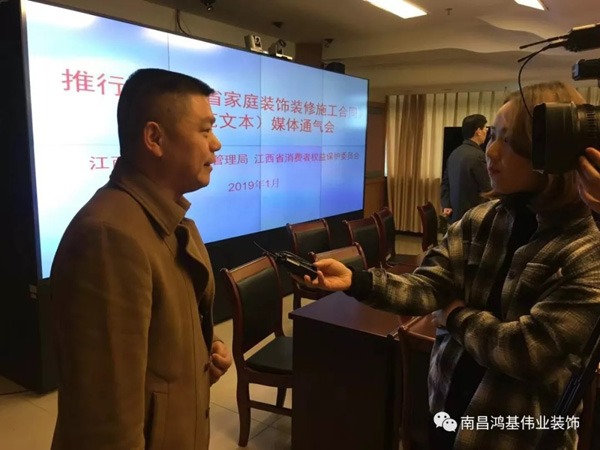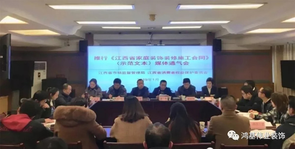 2019年1月10日,省市場(chǎng)監(jiān)督管理局(以下簡稱:省市場(chǎng)監(jiān)管局)、省消費(fèi)者權(quán)益保護(hù)委員會(huì)(以下簡稱:省消保委),省室內(nèi)裝飾協(xié)會(huì)與江西日?qǐng)?bào)、江西衛(wèi)視、中國新聞網(wǎng)等10余家政府主流媒體及行業(yè)內(nèi)率先使用家裝規(guī)范合同的鴻基偉業(yè)裝飾等裝飾企業(yè)代表應(yīng)邀出席了新聞通氣會(huì)。