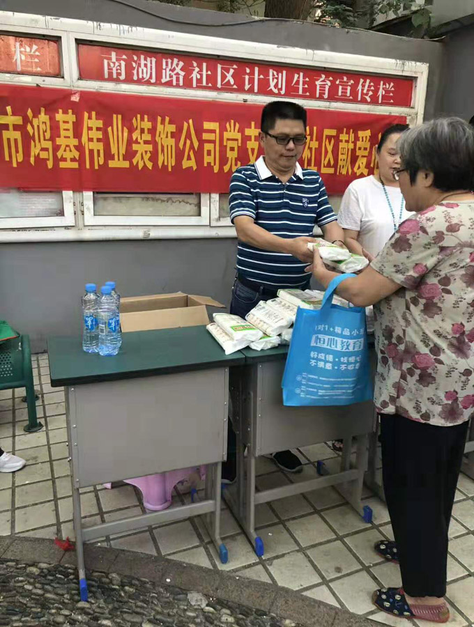 2019年9月30日上午,中共鴻基偉業(yè)裝飾黨支部聯(lián)合南湖路社區(qū)黨支部,為弘揚(yáng)中華民族敬老、愛(ài)老傳統(tǒng)美德,在社區(qū)舉行《九九重陽(yáng)進(jìn)社區(qū)獻(xiàn)愛(ài)心》活動(dòng),給社區(qū)的老人送去生活用品,送去關(guān)愛(ài)和溫暖問(wèn)候。