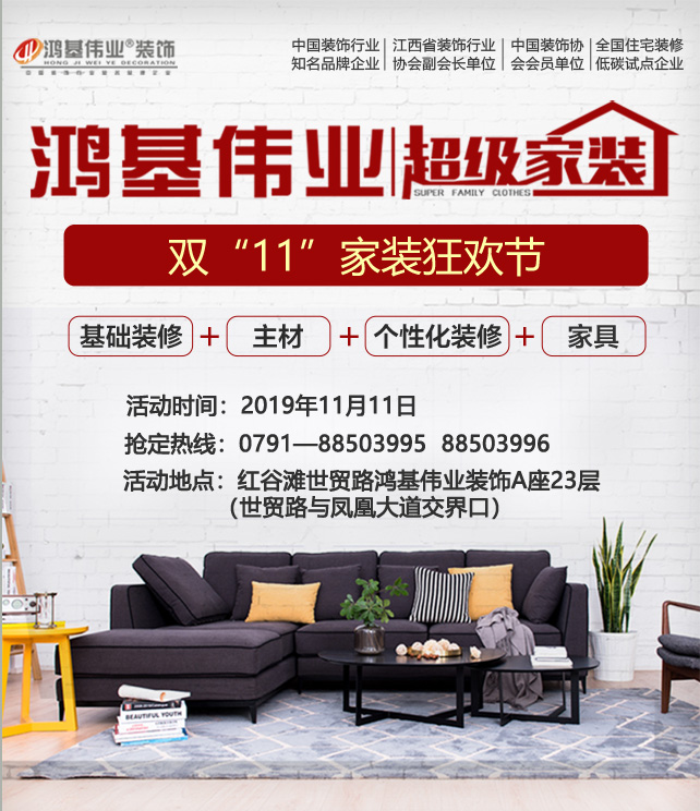 雙十一家裝狂歡節(jié)倒計時“1”天?,F(xiàn)在很多人翹首以盼的一年一度吃土剁手狂歡節(jié)要來了!??!“搶”到就是賺到,雙十一當天來定,讓您省到心動。南昌鴻基偉業(yè)裝飾也隆重推出“七重優(yōu)惠大禮”來為節(jié)日添氣氛,更是為一直支持我們的客戶朋友送優(yōu)惠!??!讓您省錢享受高品質(zhì)家居生活!??!
