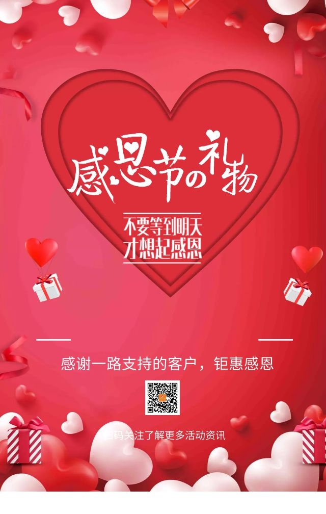 感恩節(jié),鴻基偉業(yè)裝飾感謝新老客戶一直的信任和支持,現(xiàn)推出鉅惠活動(dòng),七重大禮相送,并且感恩節(jié)當(dāng)天訂單客戶,除享受活動(dòng)優(yōu)惠以外,另享受一份神秘禮物。