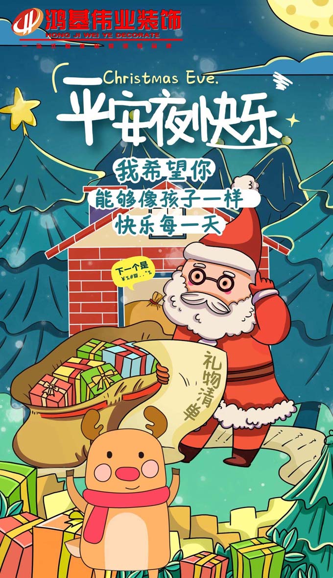 平安夜到了!南昌鴻基偉業(yè)裝飾公司陪您一起過(guò)節(jié)日,再送你一份問(wèn)候,祝大家平安幸福。送一串深深的祝福,分分秒秒都是平安吉利,傳一份濃濃的心意,點(diǎn)點(diǎn)滴滴都是平安如意。