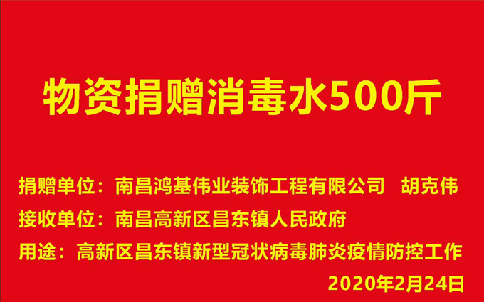 2月24日,南昌市東湖區(qū)人大代表、市“五一”勞動獎?wù)芦@得者、鴻基偉業(yè)裝飾公司董事長胡克偉先生又一次來到家鄉(xiāng)高新區(qū)昌東鎮(zhèn),通過南昌高新區(qū)昌東鎮(zhèn)人民政府捐贈500斤消毒水,用于高新區(qū)昌東鎮(zhèn)新型冠狀病毒肺炎疫情防控工作。