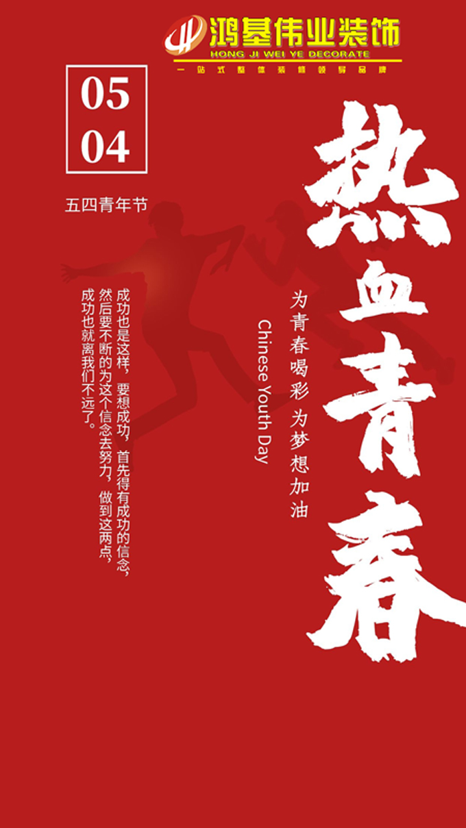 借著五四青年節(jié),這個(gè)朝氣蓬勃的時(shí)刻,鴻基偉業(yè)裝飾愿您青春不朽,歲月不老!青春的腳步是激昂,青年的時(shí)光是希望,讓拼搏的號(hào)角吹響,讓奮斗的旗幟飛揚(yáng),讓青春的歲月歡暢,讓青春的生活明亮!用青春灌溉事業(yè)磨礪出彩的人生!