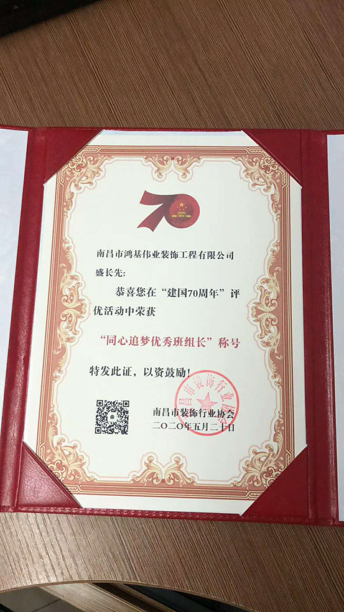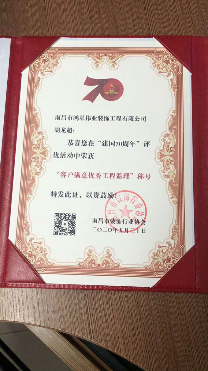 近日,南昌市裝飾行業(yè)協(xié)會傳來喜報!南昌市鴻基偉業(yè)裝飾公司員工盛長先工匠在“建國70周年”評優(yōu)活動中榮獲“同心追夢優(yōu)秀班組長”稱號!員工胡龍超在“建國70周年”評優(yōu)活動中榮獲“客戶滿意優(yōu)秀工程監(jiān)理”稱號!特此向他們表示熱烈的祝賀!