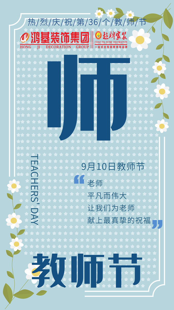 雖工作平凡,卻成就四方;講臺狹小,卻桃李天下;兩鬢斑白,卻青春永留;身體單薄,卻托起未來。鴻基裝飾集團超牌家裝祝天下老師教師節(jié)快樂!