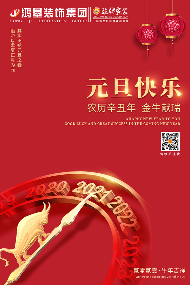 鴻基裝飾集團祝愿一直支持和信任的朋友們元旦快樂!??!元旦來到,祝大家在新年里:事業(yè)如日中天,心情陽光燦爛,工資地覆天翻,未來風(fēng)光無限,鴻基裝飾集團&超牌家裝公司將始終把客戶的利益放在第一位,為客戶提供一站式省心、省力、省時、更省錢的全包裝修。更努力為客戶提供最佳性價比的裝修效果,為每一位客戶打造一個專屬的溫馨溫暖的家。