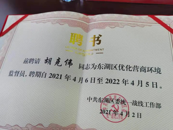 鴻基裝飾集團董事長胡克偉當選南昌市東湖區(qū)優(yōu)化營商環(huán)境監(jiān)督員