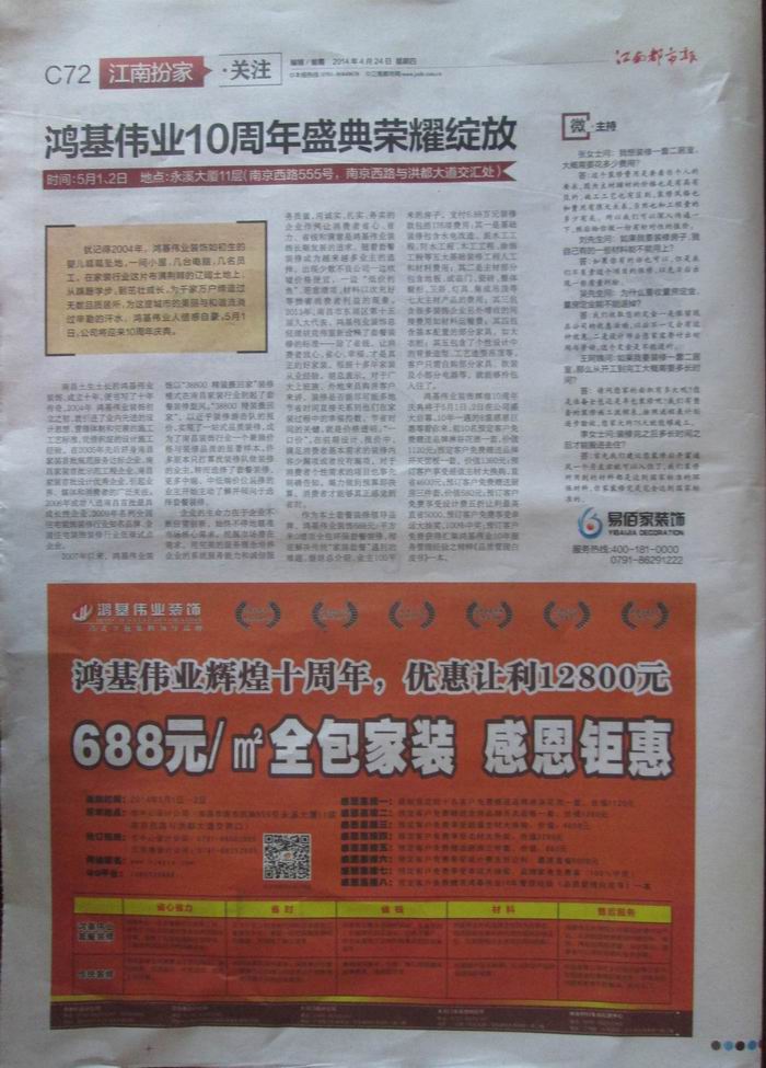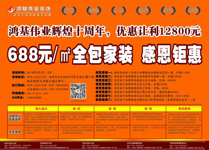 南昌全包裝修鴻基偉業(yè)裝飾輝煌10周年慶典將于5月1日、2日在公司盛大啟幕。10年一遇的8重感恩巨惠等著你來(lái)。前10名預(yù)定客戶免費(fèi)贈(zèng)送品牌淋浴花灑一套,價(jià)值1120元;預(yù)定客戶免費(fèi)贈(zèng)送品牌開(kāi)關(guān)面板一套,價(jià)值1360元;預(yù)訂客戶享受超值主材大換購(gòu),直省4600元;預(yù)訂客戶免費(fèi)贈(zèng)送廚房三件套,價(jià)值680元;預(yù)訂客戶免費(fèi)享受設(shè)計(jì)費(fèi)五折讓利最高直省5000,預(yù)訂客戶免費(fèi)享受幸運(yùn)大抽獎(jiǎng),100%中獎(jiǎng);預(yù)訂客戶免費(fèi)獲得匯集鴻基偉業(yè)10年服務(wù)管理經(jīng)驗(yàn)之精粹《品質(zhì)管理白皮書(shū)》一本。