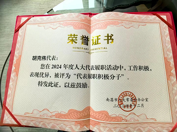 自擔(dān)任市人大代表以來,胡克偉始終以高度的責(zé)任感與使命感投身于人大代表工作,深入基層調(diào)研,傾聽民眾心聲,積極參與各類會(huì)議和活動(dòng),展現(xiàn)出了極高的工作熱情與專業(yè)素養(yǎng)。胡克偉說:“此次獲得這兩項(xiàng)榮譽(yù),既是對(duì)過往人大履職工作的認(rèn)可,更是一份沉甸甸的責(zé)任與鞭策。在未來的人大履職工作過程中,會(huì)繼續(xù)秉持初心,扎根基層,深入挖掘人民群眾在各個(gè)生活領(lǐng)域面臨的實(shí)際困難。力求提出更多兼具深度與可操作性的建議,為南昌高質(zhì)量發(fā)展添磚加瓦,貢獻(xiàn)人大代表的力量!”