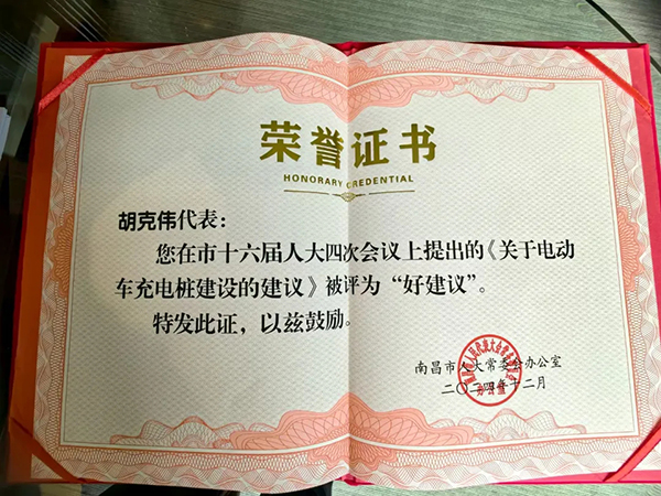 因工作積極,表現(xiàn)優(yōu)異,胡克偉獲得2024年度“代表履職積極分子”榮譽(yù)表彰。提出的«關(guān)于電動(dòng)車充電樁建設(shè)的建議»給出了一系列切實(shí)可行的實(shí)施舉措。該建議經(jīng)過層層篩選與嚴(yán)格評(píng)審,最終被評(píng)為“好建議”。