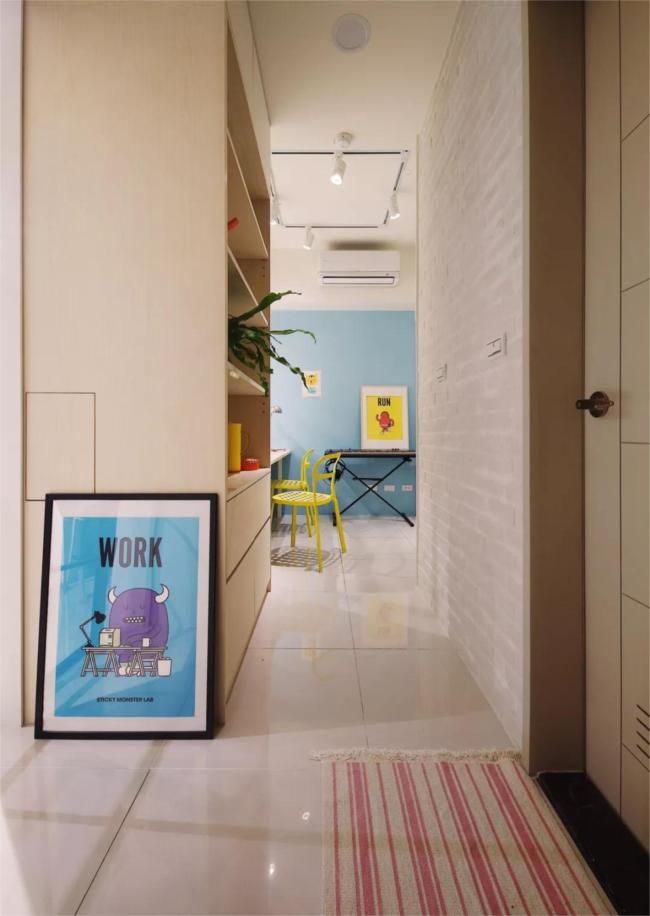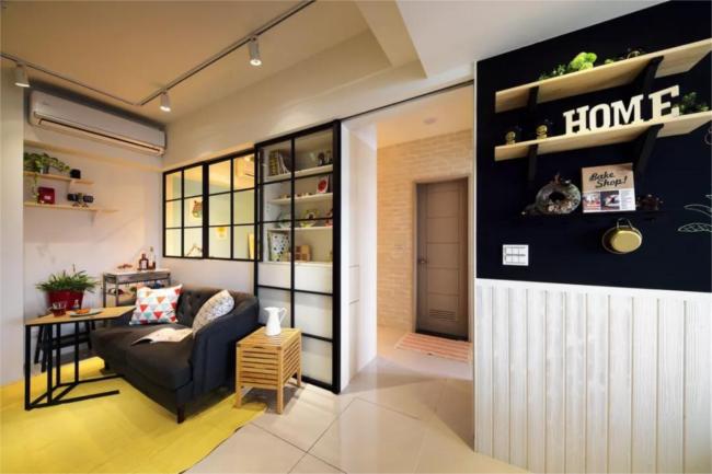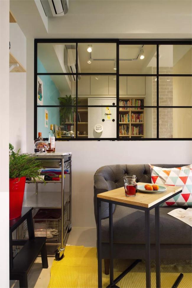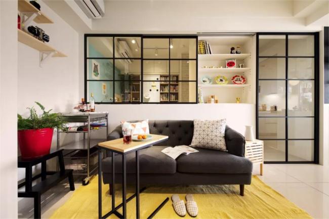 深灰色的兩人沙發(fā),以色塊抱枕加以點(diǎn)綴??蛷d與書房以黑框玻璃做為裝飾,使原本狹小的空間,變得寬敞通透起來。