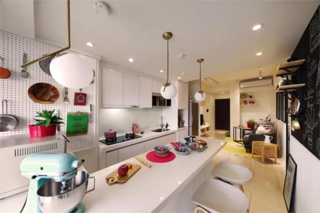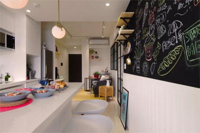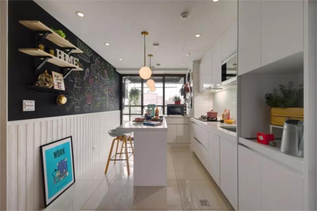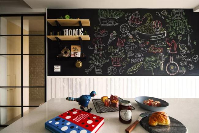 開放式的餐廳設(shè)計,簡約時尚。黑板墻是一個文藝情調(diào)而又實(shí)用的好設(shè)計,讓餐廚空間更有趣。
