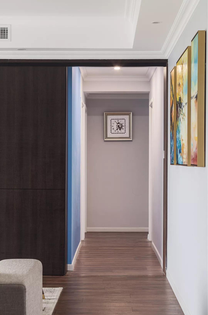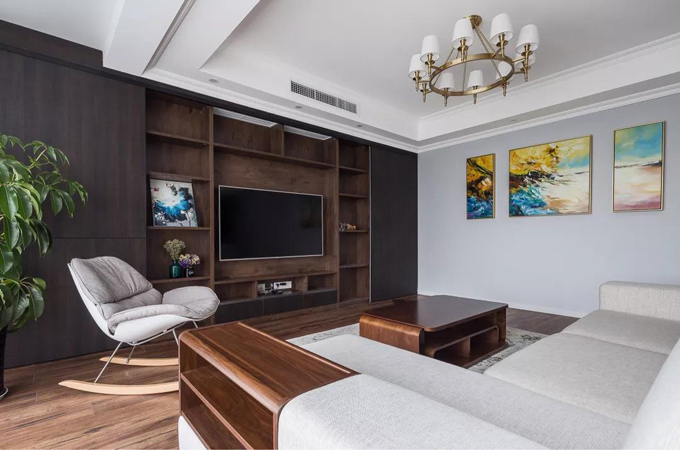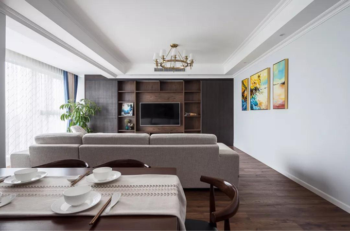 ▲客廳電視墻以深色木質(zhì)感的展示架打造,側(cè)邊淡藍色的墻面,掛上3幅抽象裝飾畫,顯得穩(wěn)重而又有藝術(shù)感。米白色以沙發(fā),還有側(cè)邊一張休閑沙發(fā)椅,也帶來了幾分愜意的氣息。