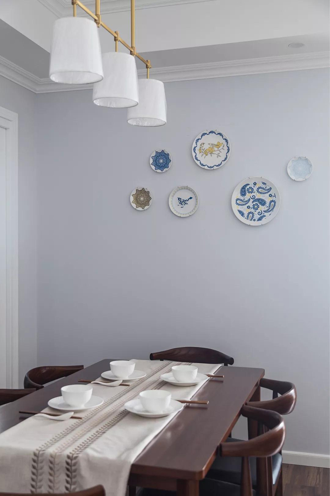 ▲餐廳背景墻的幾只掛盤,搭配在這套穩(wěn)重端莊的餐桌椅下,顯得格外的文雅情趣。