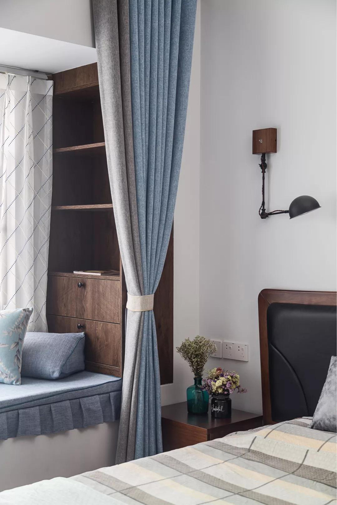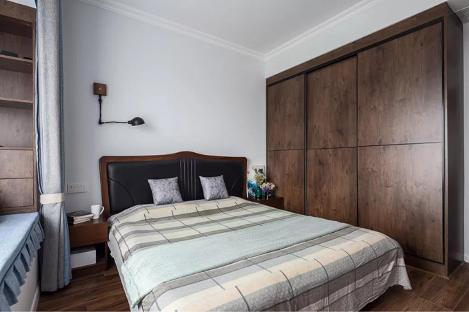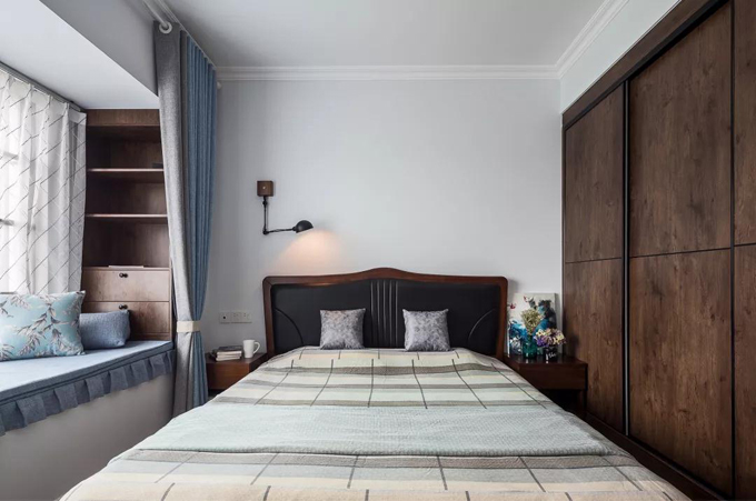 ▲臥室空間的衣柜與床體的木材也是比較深色,搭配上穩(wěn)重的床單與窗簾,營造出莊重大方的空間感。