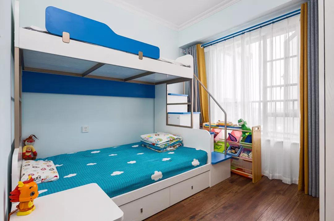 ▲兒童房空間簡單的淡藍色墻面,搭配上一套實用的上下鋪,在狹小的空間裝出了一個舒適居住功能。