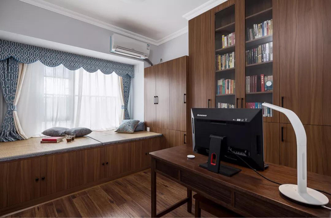 ▲書房空間較大,在靠窗位置創(chuàng)一個榻榻米,里側(cè)則是大面積的書架+一張居中擺放的書桌,寬松實用的書房,搭配書架里豐富的藏書,在不經(jīng)意間透著主人愛學(xué)習(xí)的性格。
