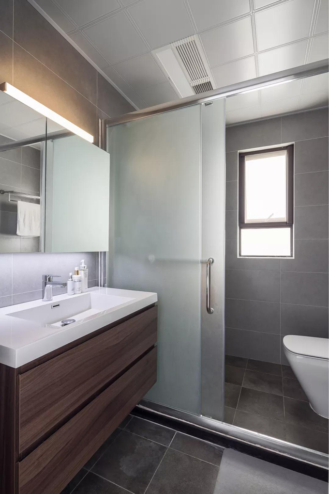 ▲衛(wèi)生間的干濕區(qū)以磨砂玻璃推門隔斷,整體灰色調(diào)的地面墻面磚,搭配深木色的洗手盆,裝出實用而又簡約的感覺。