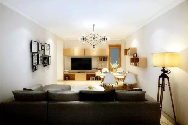 ▲客餐廳的設(shè)計(jì)以淺色調(diào)為主,采光不好所以整體空間采用象牙白色,電視墻進(jìn)行收納展示,由于房高有限,老人喜歡簡(jiǎn)單干凈的風(fēng)格,以石膏線過(guò)度,烘托整體家居氛圍。