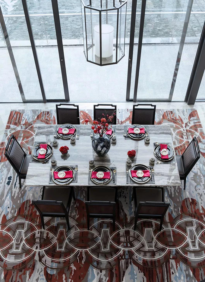 步入餐廳強(qiáng)烈的視覺感受,尊貴而熱烈的色彩,莊重典雅的氣韻流動(dòng)其間,色彩撞擊,洋溢著激揚(yáng)的復(fù)古精神卻不顯沉悶。端坐的家具造型,精湛的手工藝,以及銅錢紋地毯都代表著富貴與世享。