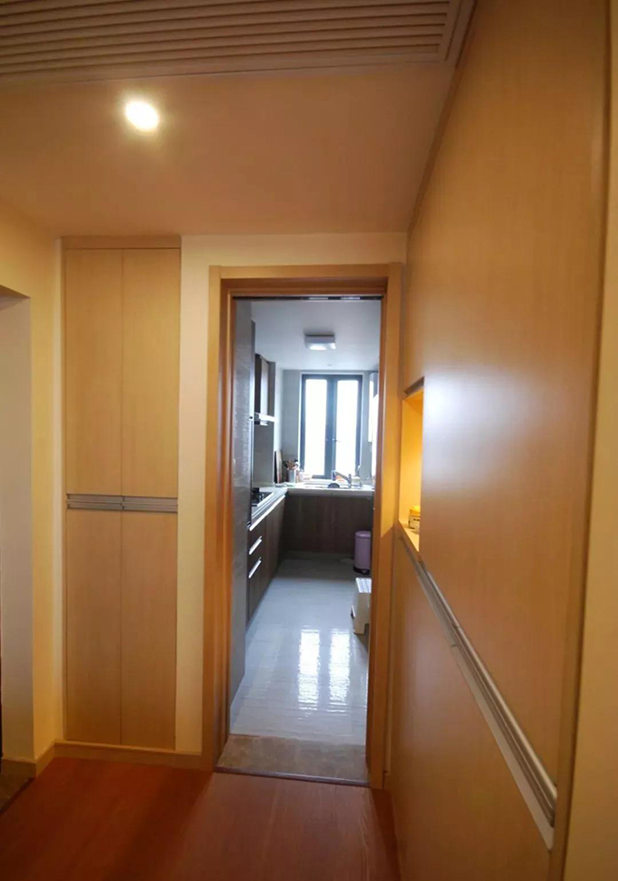 進(jìn)門(mén)左手邊的位置設(shè)計(jì)師做了一個(gè)小型收納柜,一進(jìn)門(mén)可以把脫下來(lái)的外套、帽子、圍巾等掛在里面,封閉的空間不容易落灰,也非常好清理。