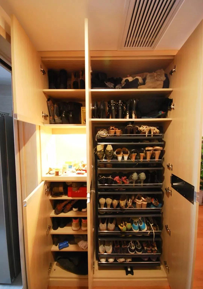 進(jìn)門(mén)正對(duì)面處是鞋柜,收納功能和質(zhì)量非常好。將每層格擋的傾斜角度都錯(cuò)開(kāi),而且鞋架還可以拉開(kāi)、收縮,利用有限的空間,折疊、穿插放鞋,是節(jié)省空間的好物??催@滿(mǎn)滿(mǎn)當(dāng)當(dāng)?shù)男辽僖灿腥氖p了。