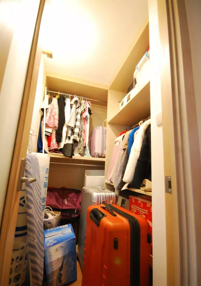 背面是衣帽間,雖然面積小,但是利用隔板將空間分隔成不同大小的區(qū)域,分別用來(lái)收納不同功能的東西,比如大格的空檔可以塞行李箱,小格子就可以放一些衣物,照樣可以把多、雜亂的東西分類(lèi)收拾起來(lái)。