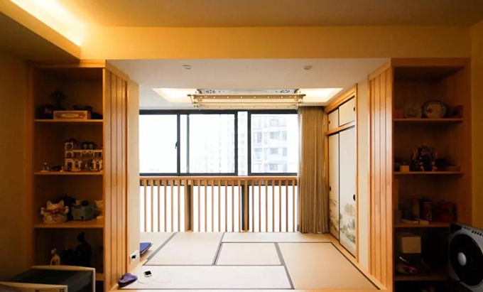 考慮整體的收納空間要夠,所以設(shè)計(jì)師把陽(yáng)臺(tái)的空間也利用起來(lái),做成了日式風(fēng)格的榻榻米。屏風(fēng)式的推拉門(mén)節(jié)省了空間,也有收納的功能。將物品隱藏在后面,整體淡雅有禪意。