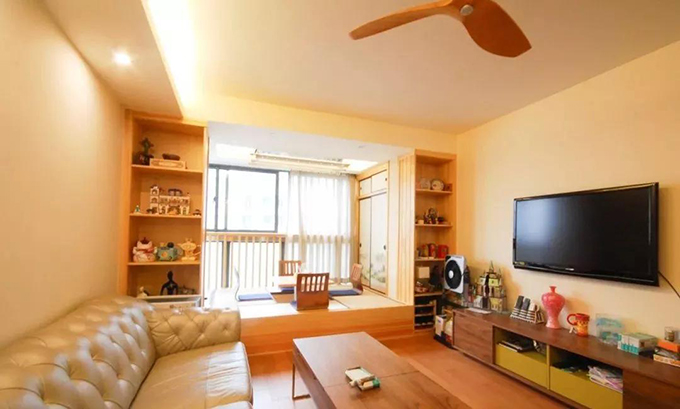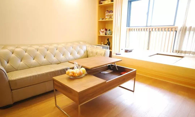 日式榻榻米中間還有一個(gè)升降桌,升起桌子,擺好座椅,放上茶盤(pán),就是一塊享受寧?kù)o的禪意空間。把桌子降下去,坐在榻榻米上曬太陽(yáng),頗有“歲月靜好”的感受。