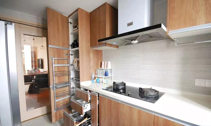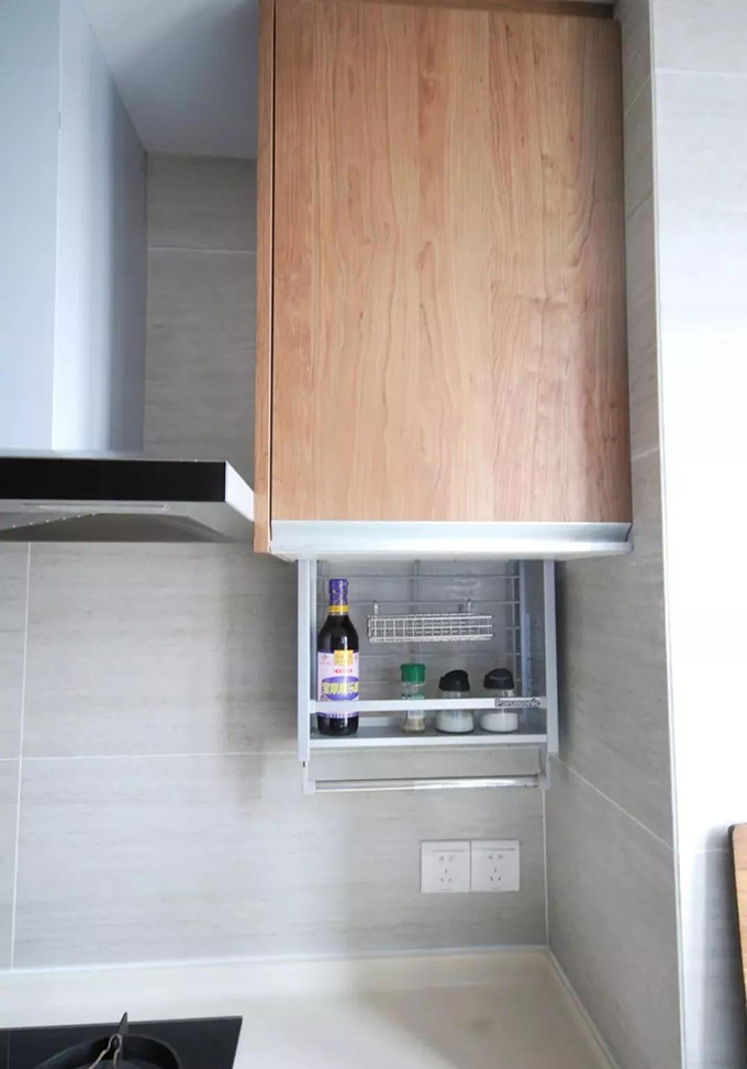 定制的家具有一點(diǎn)非常好的是可以根據(jù)業(yè)主的使用習(xí)慣制作,比如馬先生家做飯調(diào)料習(xí)慣放右邊,那就在右手邊的位置做一個(gè)帶拉桿的調(diào)料收納籃,水槽邊就是瀝水碗柜,洗過(guò)的碗筷順手就可以放進(jìn)去。
