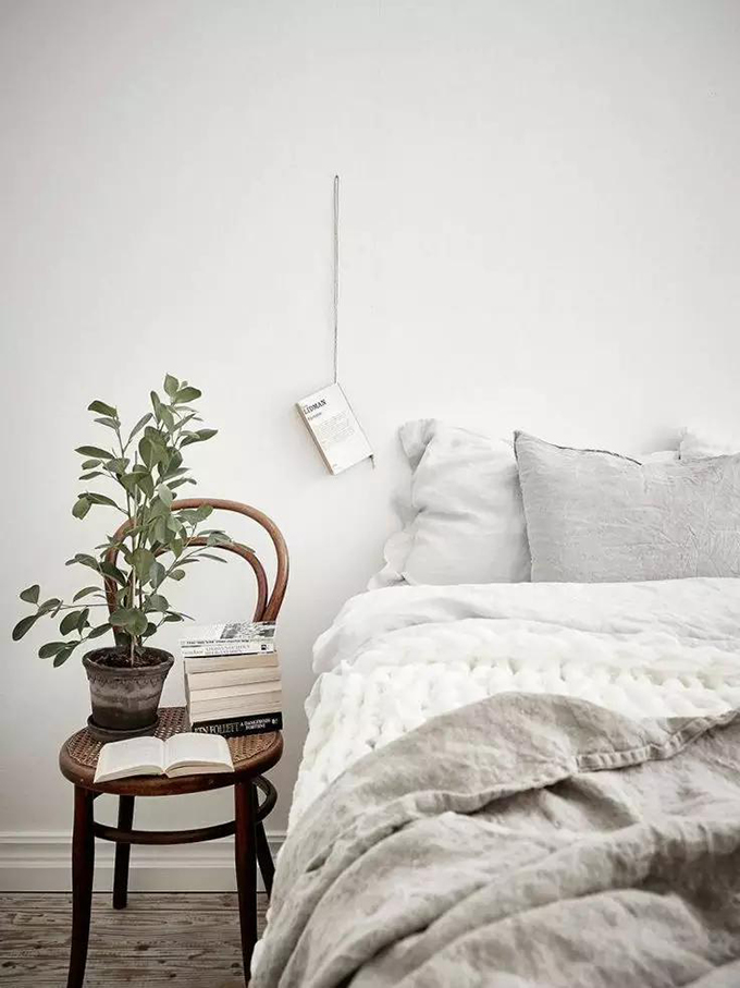 2上墻的置物架 如果由于戶型的原因,放完床后,完全沒有床頭柜的位置,可以考慮讓這個(gè)收納設(shè)計(jì)上墻,因?yàn)椴恢挥械厣系拇差^柜才有收納功能,把床頭一邊或者兩邊的墻上設(shè)計(jì)一個(gè)能收納又能裝飾的置物架,或者置物框。比起普通的床頭柜,掛在墻上的小巧壁柜完全不占空間,剩余空間可以給其他家具。 3高顏值的椅子